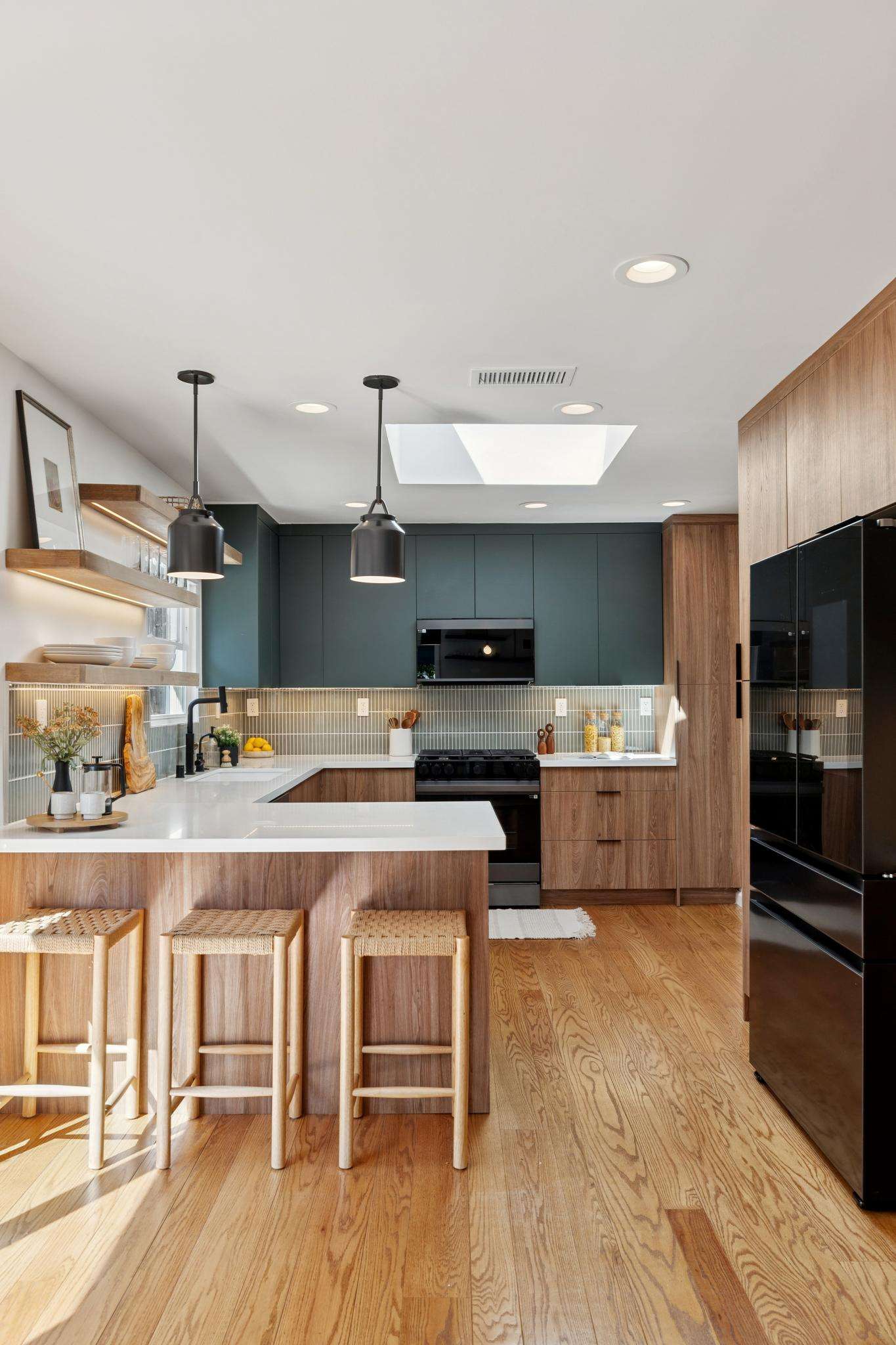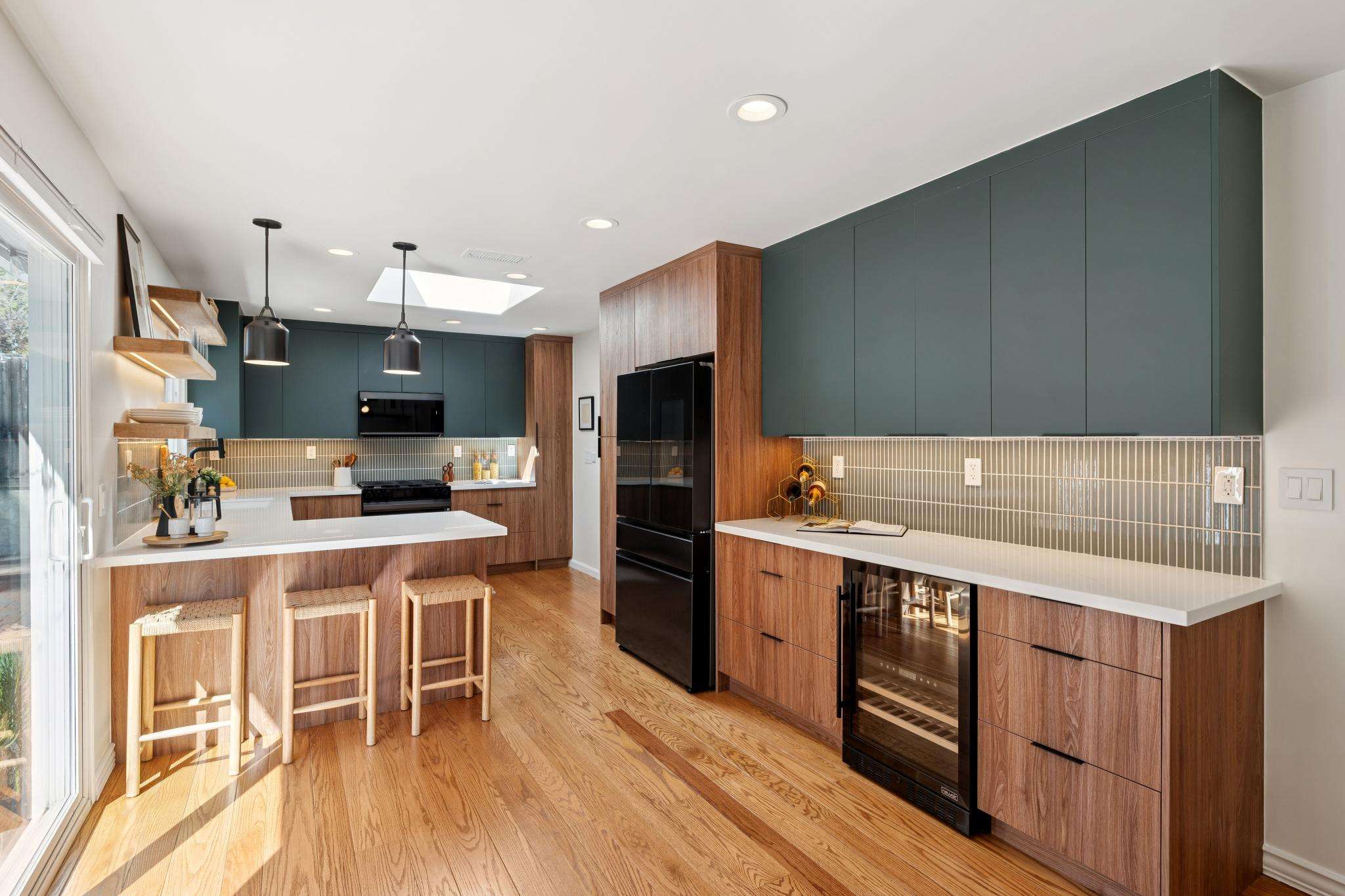 A welcoming foyer and grand living room with beautiful variable-plank hardwood floors lead to a stunning open-concept dining room and showcase kitchen featuring a Samsung Bespoke appliance suite, abundant custom cabinetry, breakfast/wine bar, expansive skylight, and premium designer finishes. Thoughtful design and craftsmanship shine in every detail, blending function, storage, and style.