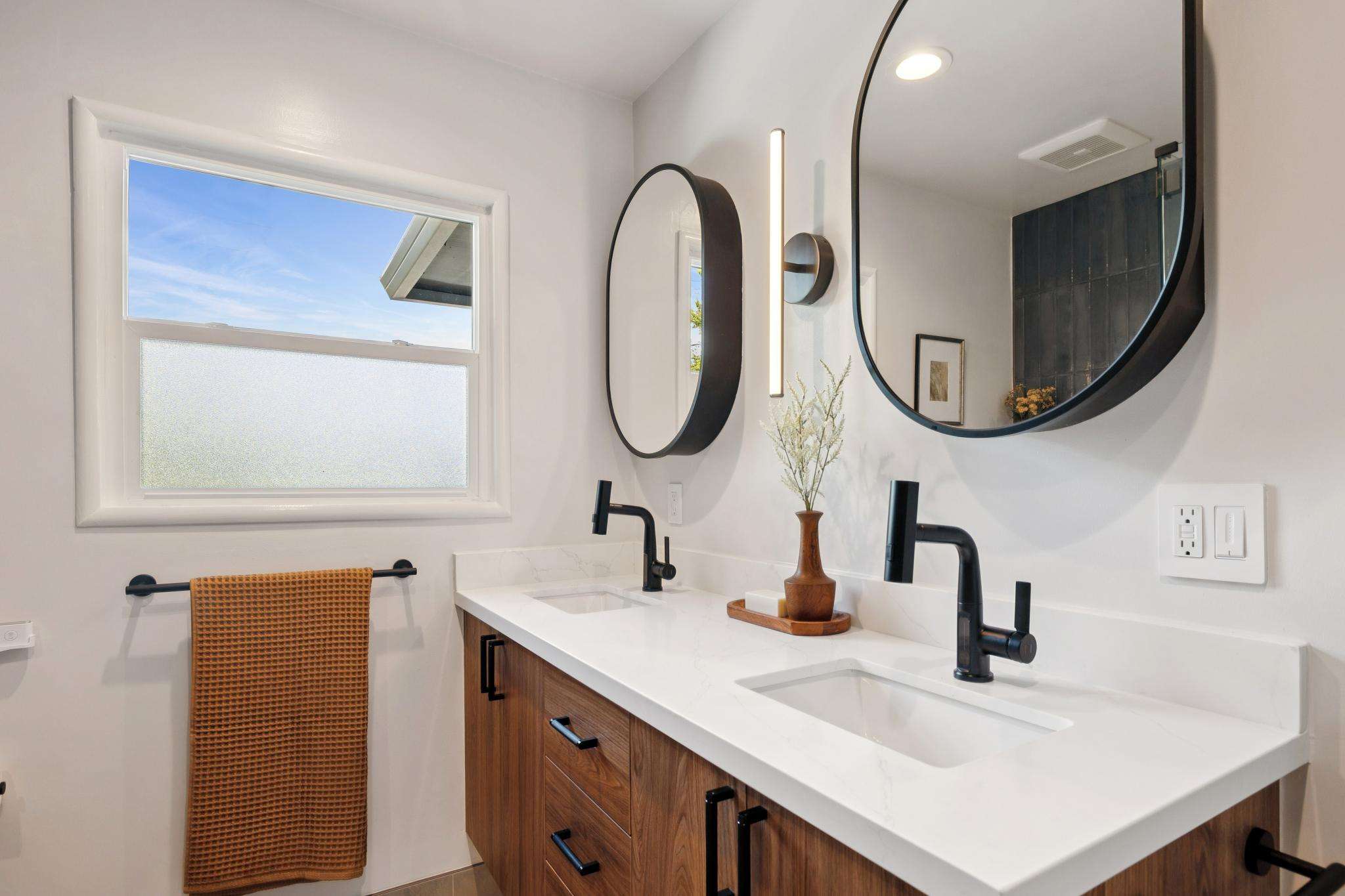 Wake up to sunrise views from the spacious primary bedroom, complemented by a spa-like ensuite bath with tech-savvy fixtures and luxurious tile detailing. Two additional bedrooms offer flexibility for guests, kids, or a home office, including one with a private ensuite bath. A centrally located hallway laundry room adds everyday convenience.